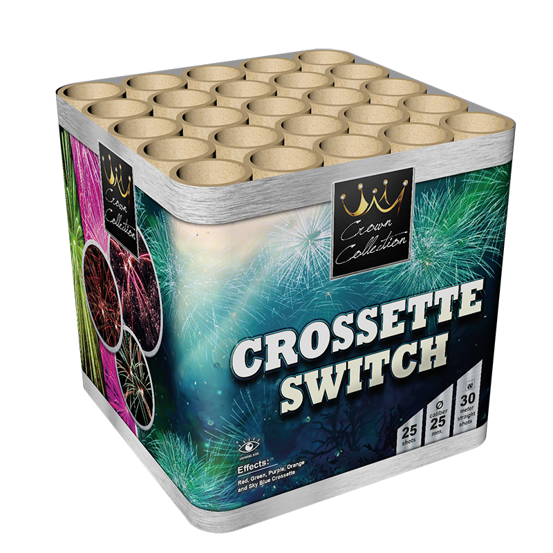 Effect voor echte fijnproevers. Deze crossette effecten komen uit 25 mm tubes en splitten hoog in de lucht. De kleuren zijn bizar fel en blijven heerlijk lang hangen.