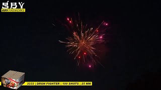 DRGN Fighter, 100 shots compound met 25mm kaliber tubes. Deze compound vecht zich naar een positie in het luchtruim. Helder rode parels met schittering van goud, blauwe parels met schittering van goud, paarse parels met schittering van goud, kopergouden palmen met blauwe parels, kopergouden palm met groene toppen en palmen met rood/roze dahlia, een schitterende vulling met voldoende diversiteit.