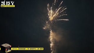 Shinobi, 10 schuss 20mm Batterie. Sierlijke gouden staarten met een gekleurde komeet ontpoppen tot dikke gouden palmen.