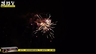 Hexenbesen, 72 schuss 20mm Pyromould compound. Rood/Blauw, Rood/Wit, Goud/Blauw, Goud/Rood, Goud/Dragon Egg, Crackling en Blink, de Hexenbesen heeft het allemaal!