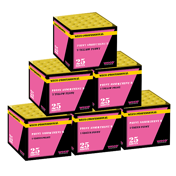 WECO Peony Assortment B. Set bestaande uit 6 zware professionele Pyromould siercakes. De set bestaat uit 3 stuks Blue Peony effect en 3 stuks Yellow Peony effect.