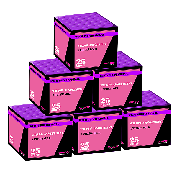 WECO Willow Assortment. Set bestaande uit 6 zware professionele Pyromould siercakes. De set bestaat uit 3 stuks Golden Willow Red effect en 3 stuks Golden Willow Green effect.