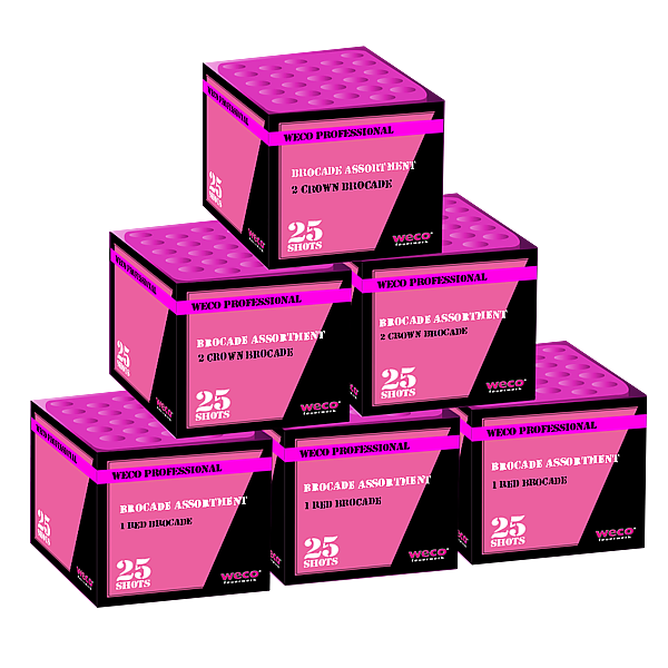 WECO Brocade Assortment. Set bestaande uit 6 zware professionele Pyromould siercakes. De set bestaat uit 3 stuks Brocade Red effect en 3 stuks Brocade Crown effect.