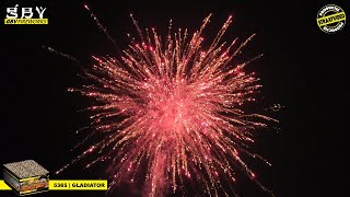 Gladiator, 100 shots 30mm compound. Deze compound heeft het maximale formaat van 30mm buizen, hierdoor kunnen de grootste haalbare effecten geschoten worden. Goud met rode glitters, puur gouden glitterpalm, en een mega snelle ramfinale.
