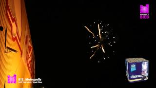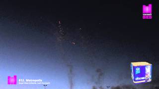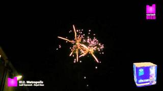 36 schots komeet doet de stad oplichten: telkens worden gouden kometen gecombineerd met a) blauwe bouquetten, b ) blauwe sterren, c) witte glitterbouquetten, d) zilveren glitters, e) groene glitterbouquetten, f) groene glitters, g) crackling, 263,7 gram kruit.