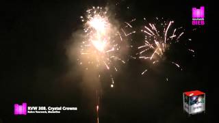 Exclusieve 30 shots salvo cake met paarse knal effecten, afwisselend met goud blinkende staarten en oceaan blauwe regens, 283 gram kruit.