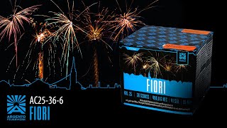 Fiori van Argento Feuerwerk is een 36 schots 25 mm cake en heeft gouden effecten met gekleurde tips!