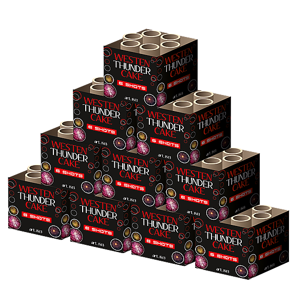 BAM! De rammer voor je oudejaarsavond; de Westen Thunder Salvo. Kleine cake met 6 schoten welke als salvo allemaal tegelijkertijd de lucht in worden gejaagd. De topper om knallend het nieuwe jaar in te luiden! Speciale Westen aanbieding per 10 stuks!