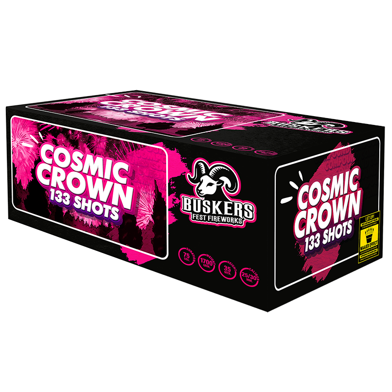 Bekroon de nacht met deze complete eindshow met unieke kleurcombinaties en waaiervorm effecten. Eindshow van dikke spinners en megacrackling wolken.