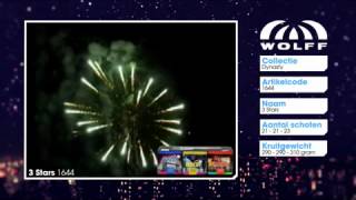 3 top cakes van de bovenste plank; 3 zware multishot cakes met meerdere verschillende grote effecten en prachtige heldere sterrenkleuren van topniveau, 900 gram kruit totaal. Bestelsite Wolff Vuurwerk: wolff-vuurwerk.nl